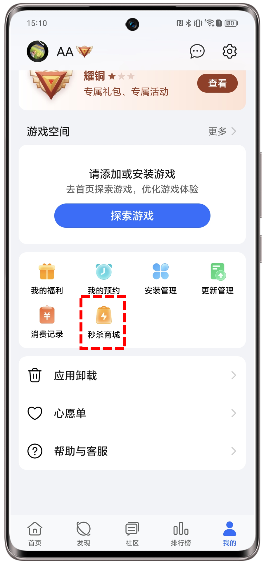 荣耀应用市场-我的-秒杀商城/游戏内弹窗