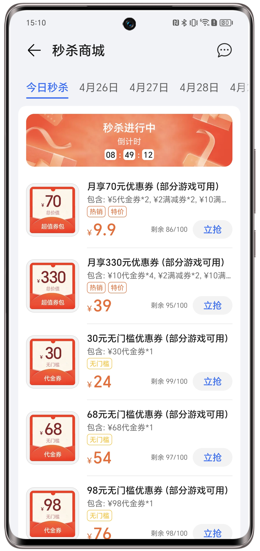 秒杀优惠券的活动以及力度会不定期更新,具体您可根据页面提示进行操作,如游戏内弹窗页显示进入应用市场秒杀商城,则可通过该路径进入后切换对应日期查看相关折扣优惠券的活动时间