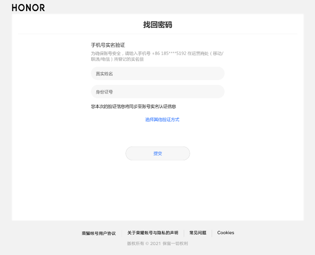 进入网页端(https://hnid-drcn.cloud.honor.com),点击右上角登录>密码登录>忘记密码>输入荣耀账号>填写账号及验证码>如跳转到手机号实名页面,需填写手机号在运营商登记的真实姓名和身份证号,点击“开始验证”。