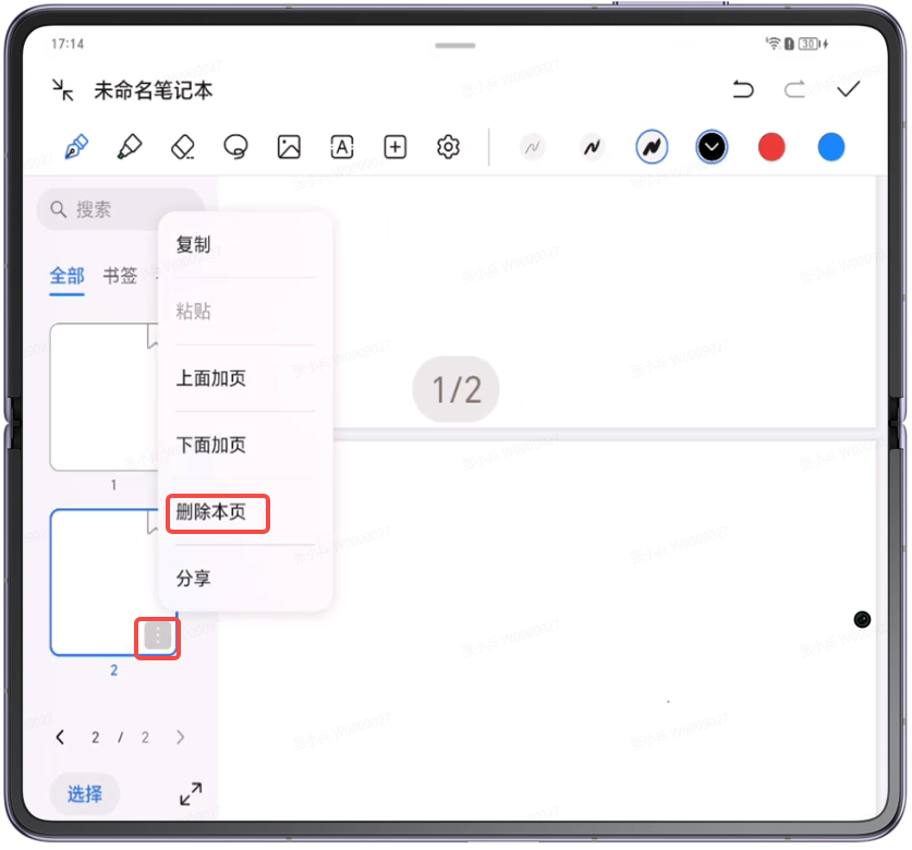 首先先选中要删除单页的手写笔记,然后点击左上角选择页码图标