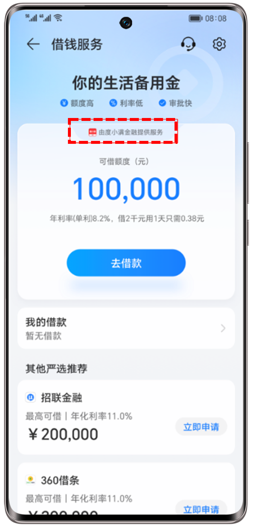 - 如对操作流程或到账时间存在疑问,请联系为您提供服务的金融机构,您可以在借钱服务界面点击右上角客服按钮,拨打相应金融机构的客服热线进行咨询(提供服务的金融机构可在借钱服务首页“由***提供”查看)。