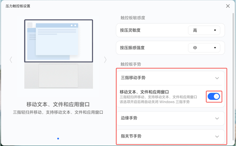- 在任务栏中,单击荣耀电脑管家图标,单击压力触控板卡片,确保三指移动手势、边缘手势和指关节手势开关已开启。