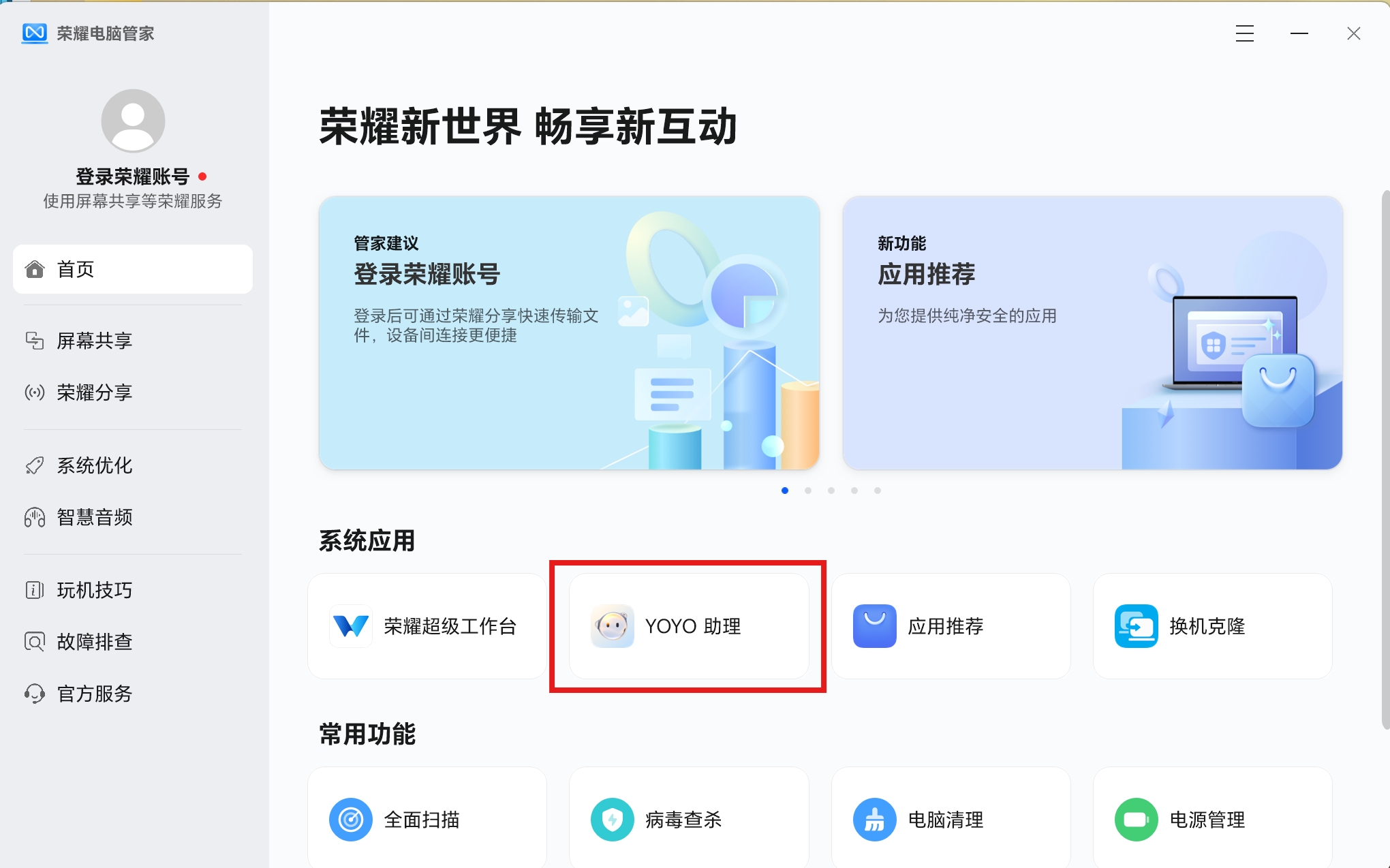 - 点击电脑管家首页“YOYO助理”卡片,跳转至下载界面,下载安装“YOYO助理” (如您已安装“YOYO助理“请跳转至步骤2)。
