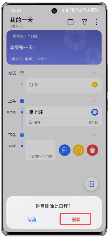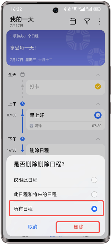 方法3(适用于MagicOS 8.0及以上版本):在我的一天页,左滑这个重复日程,点击删除,选中所有日程,点击删除,即可删除这个重复日程。