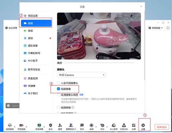 - 第三方应用中(例如腾讯会议、钉钉):进入第三方应用的设置中,正插的时候需要选中镜像模式功能,反插的时候需要取消选中镜像模式功能。