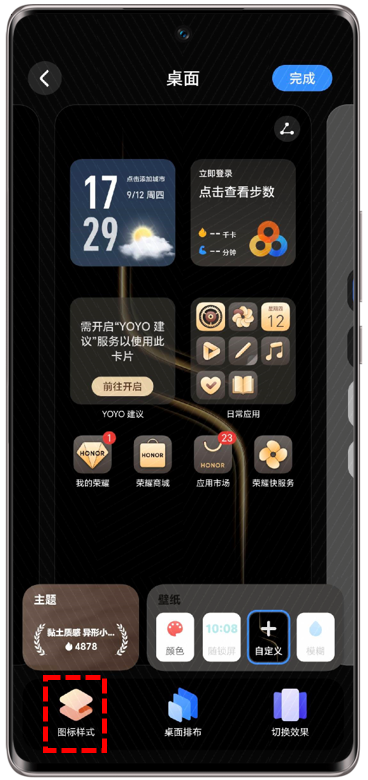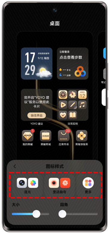支持适配的图标:计算器、联系人、拨号、邮件、图库(相册)、镜子、短信、系统设置、SIM 卡应用、SIM 卡应用2、笔记(备忘录)、录音机、换机克隆、主题、玩机技巧、相机、应用市场、指南针、文件管理器、游戏中心、我的荣耀、荣耀商城、系统管家、温度计、时钟、日历、天气、文件夹、荣耀运动健康、荣耀俱乐部、荣耀智慧空间、荣耀亲选、荣耀文档、智能遥控、查找设备、阅读、音乐、环球行、视频、浏览器、荣耀钱包。