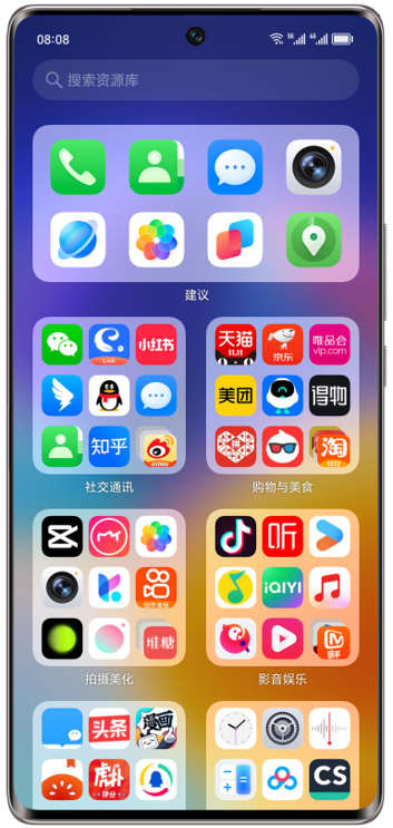 资源库会根据功能将设备内已安装的应用进行自动分类,以便快速查找。在桌面长按应用后如选择移除桌面图标,应用将不会被卸载,可以在资源库内查看。