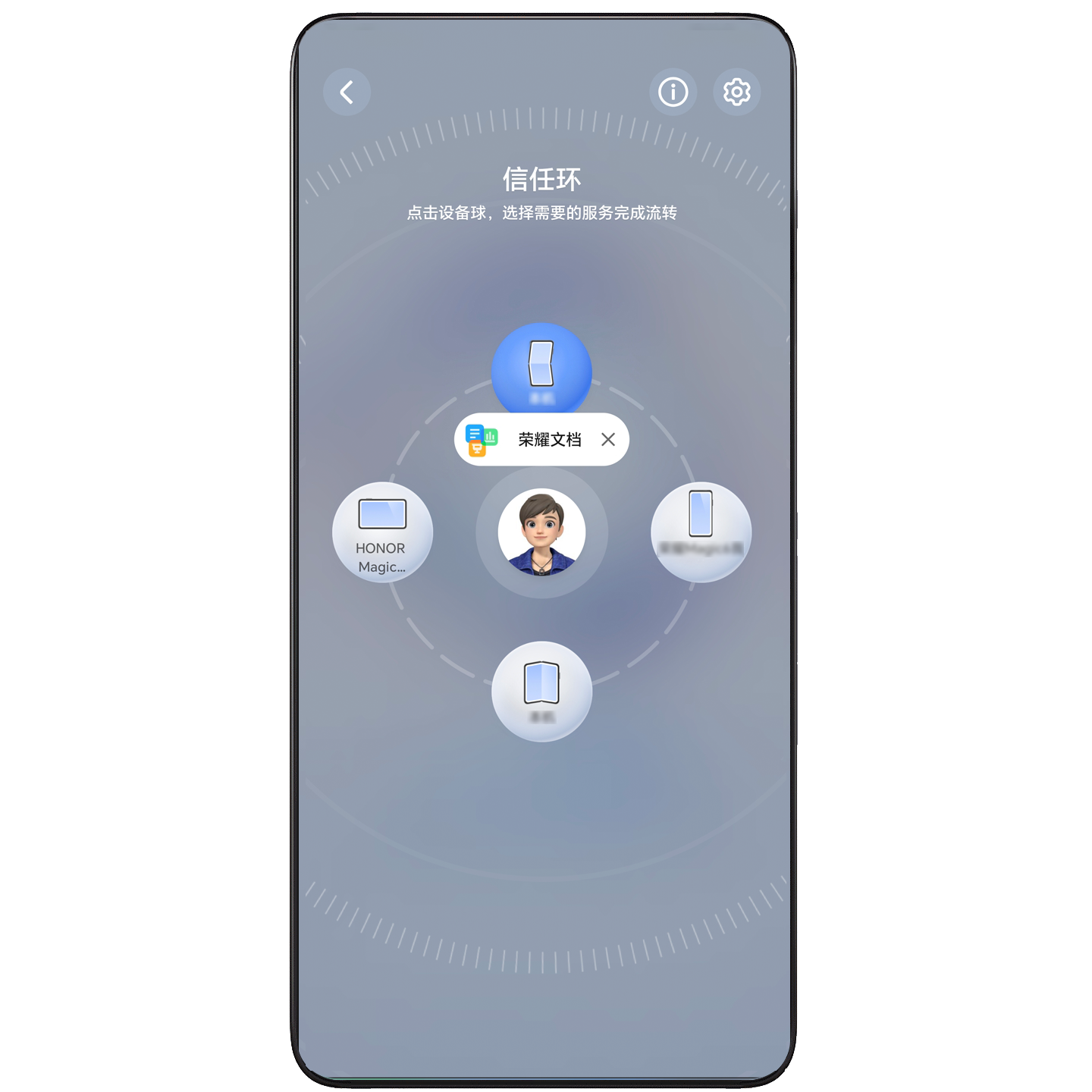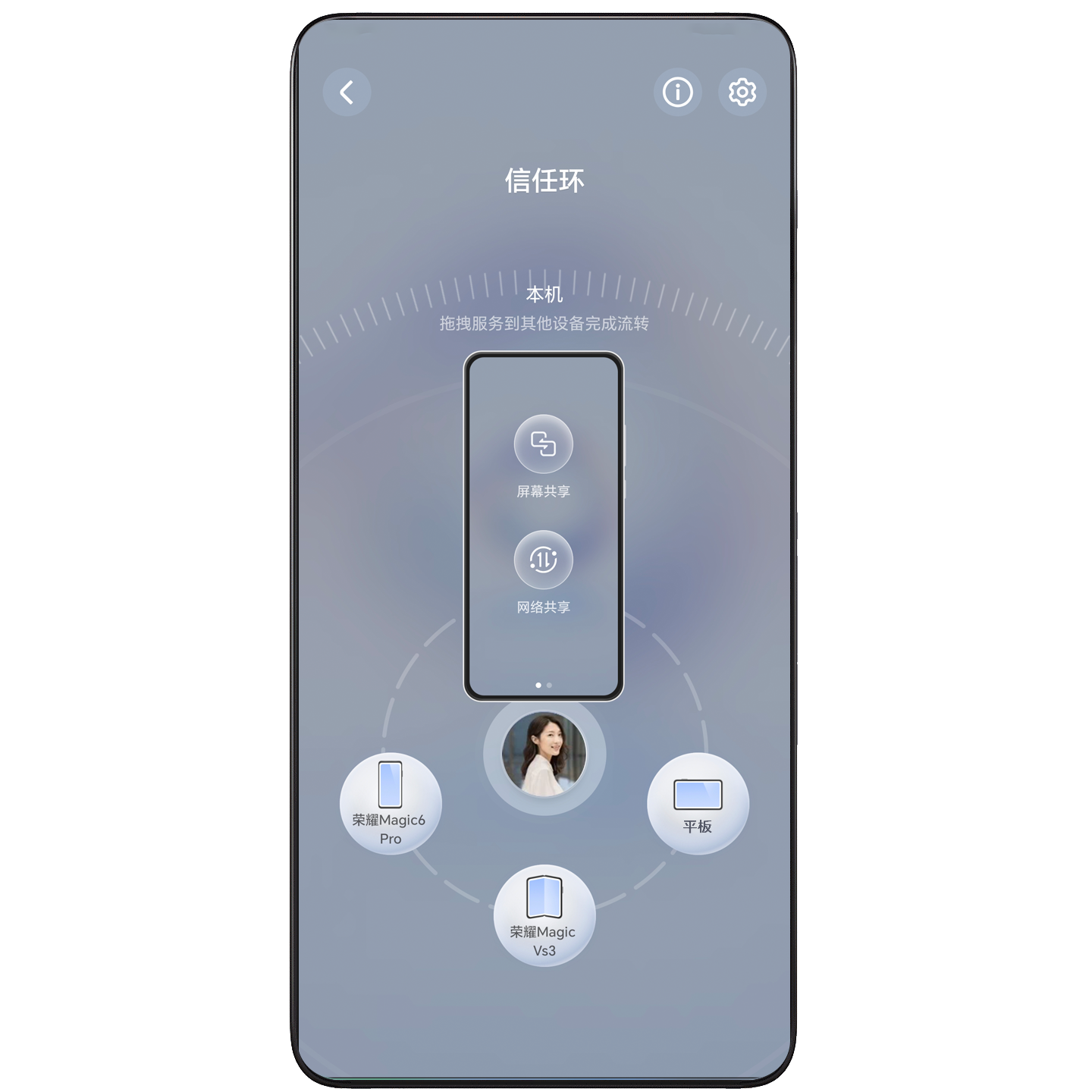 智慧互联信任环接入了丰富的设备和服务,在信任环页面可见可控。同荣耀账号的手机、平板、电脑、耳机、手表等设备自动显示在信任环页面,一目了然。在信任环页面,只需简单操作就可调用信任环上各设备的优势服务流转至其他设备,在一个设备的信任环页面就能掌控环中全部设备的服务自由流转。通过信任环页面,还可以轻松跨设备流转应用,便捷高效。