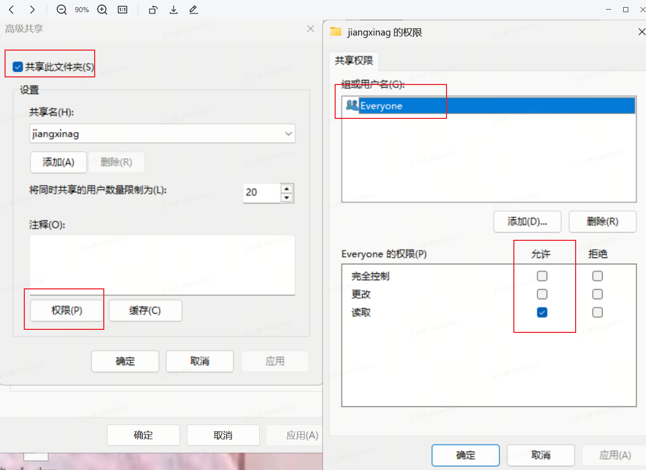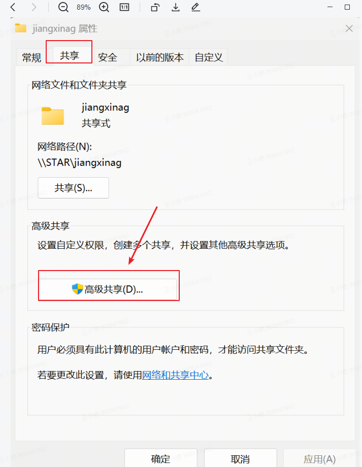 2. 在共享选项卡中,点击“高级共享”按钮,勾选“共享此文件夹”选项。可以根据需要设置共享文件夹的名称,点击“权限”按钮,设置共享文件夹的访问权限。