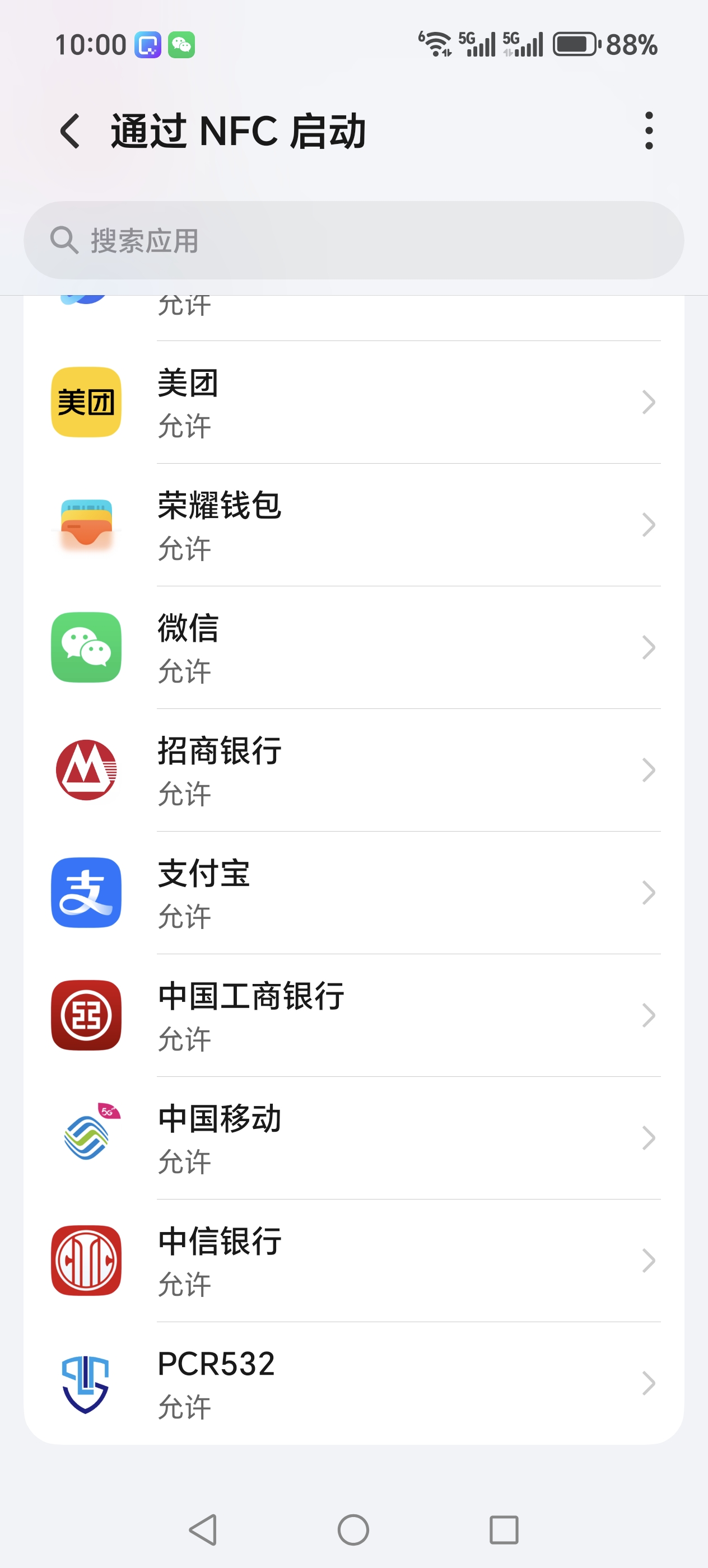 在“设置”APP中搜索NFC,点击“通过NFC启动”,在列表中找到支付宝并设置为“允许”。