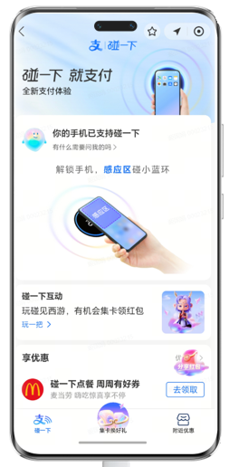 请您打开支付宝-我的-右上角设置-支付设置-碰一下支付,可以查看手机当前是否支持碰一下功能,并打开此功能。