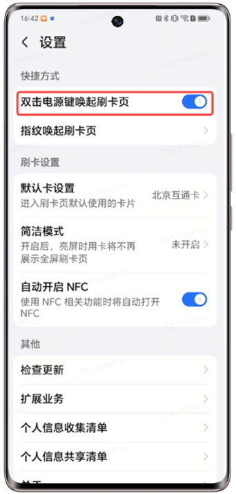 >关闭双击电源唤起刷卡界面。