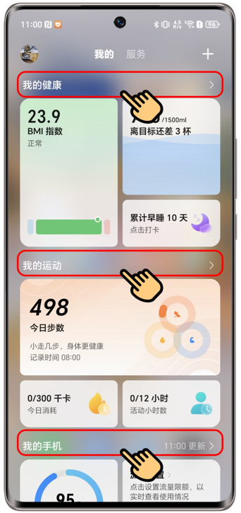 - 进入我的页面:桌面右划进入负一屏主页,在负一屏主页右划可进入负一屏我的页面;