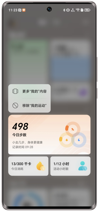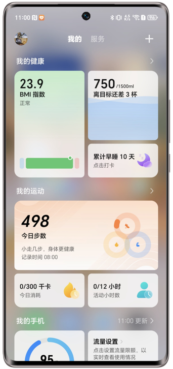 负一屏全新推出“我的”页面。在我的页,可快速查看和管理个人健康、运动、设备以及日程相关数据。