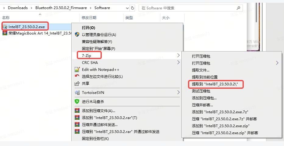 2.下载好的驱动压缩包解压到最里层的exe文件,解压路径Bluetooth 23.50.0.2_Firmware.zip\Software\荣耀MagicBook Art 14_IntelBT_23.50.0.2.zip(以荣耀MagicBook Art 14 为例)。