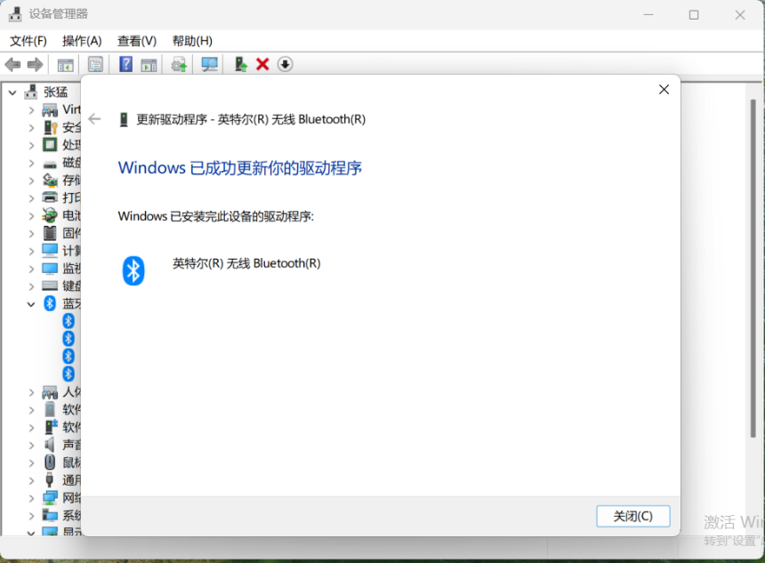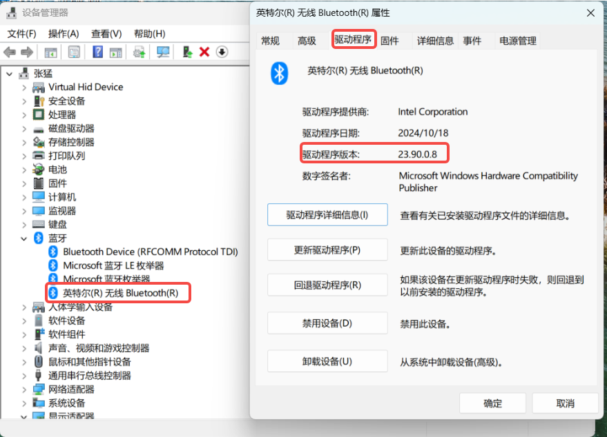 12.查看驱动是否安装成功。双击“英特尔(R)无线Bluetooth(R)”,点击“驱动程序”,查看“驱动程序版本”是否为安装的驱动版本(官网下载的驱动文件夹名称里会有版本号)。版本号不一致则未安装成功,可以从第5步开始重新安装。