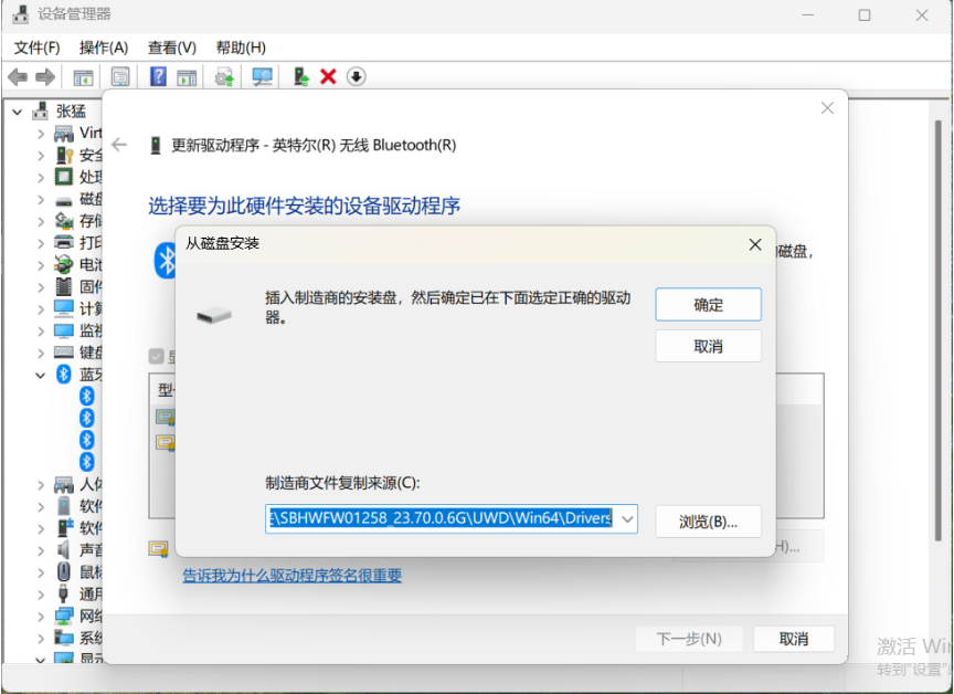 9.点击“浏览”,选取前面解压好的驱动文件所在的路径中的inf文件,点击“确定”。