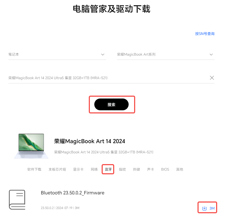 1.进入官网下载驱动的界面(电脑管家及驱动下载服务)下载对应驱动,选择对应的电脑型号,点击“搜索”,选择“蓝牙”,点击右下角的下载。