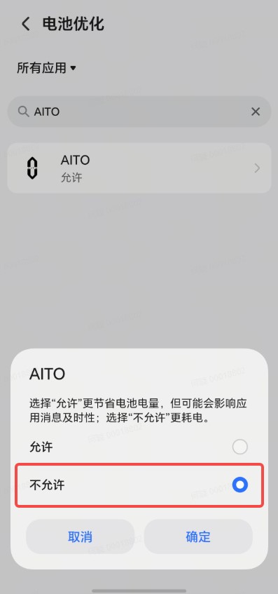 - 电池优化:设置>搜索“电池优化”>找到对应的应用,选择“不允许”。例如下图: