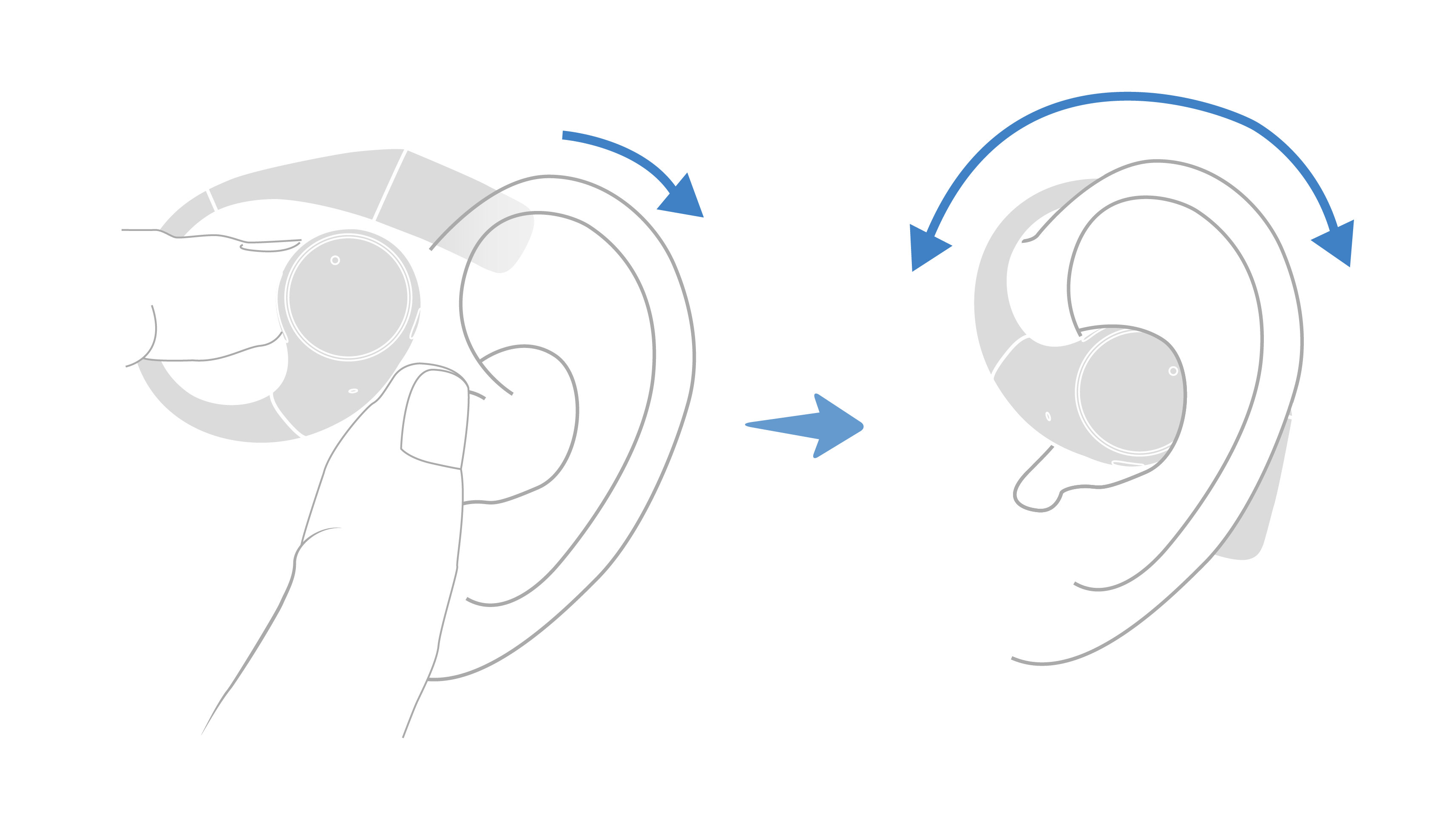 轻轻按压并前后旋转耳包和耳挂,直到完全贴合耳部轮廓,完成佩戴。