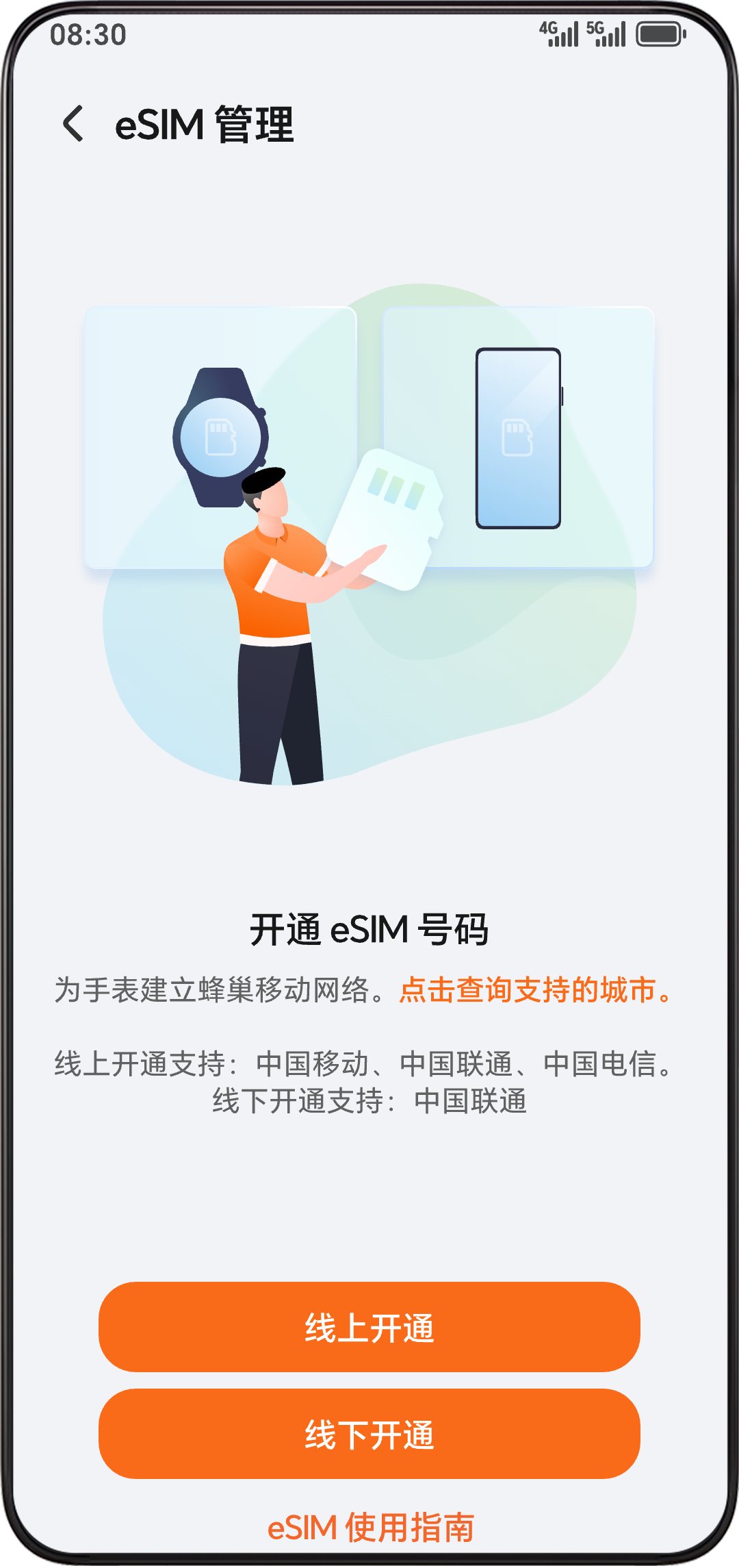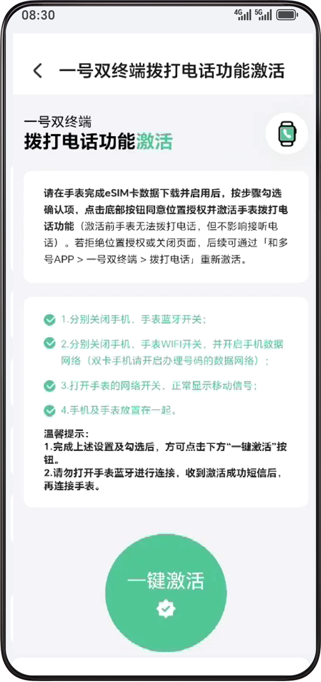 开通时手表需保持20%及以上的电量。