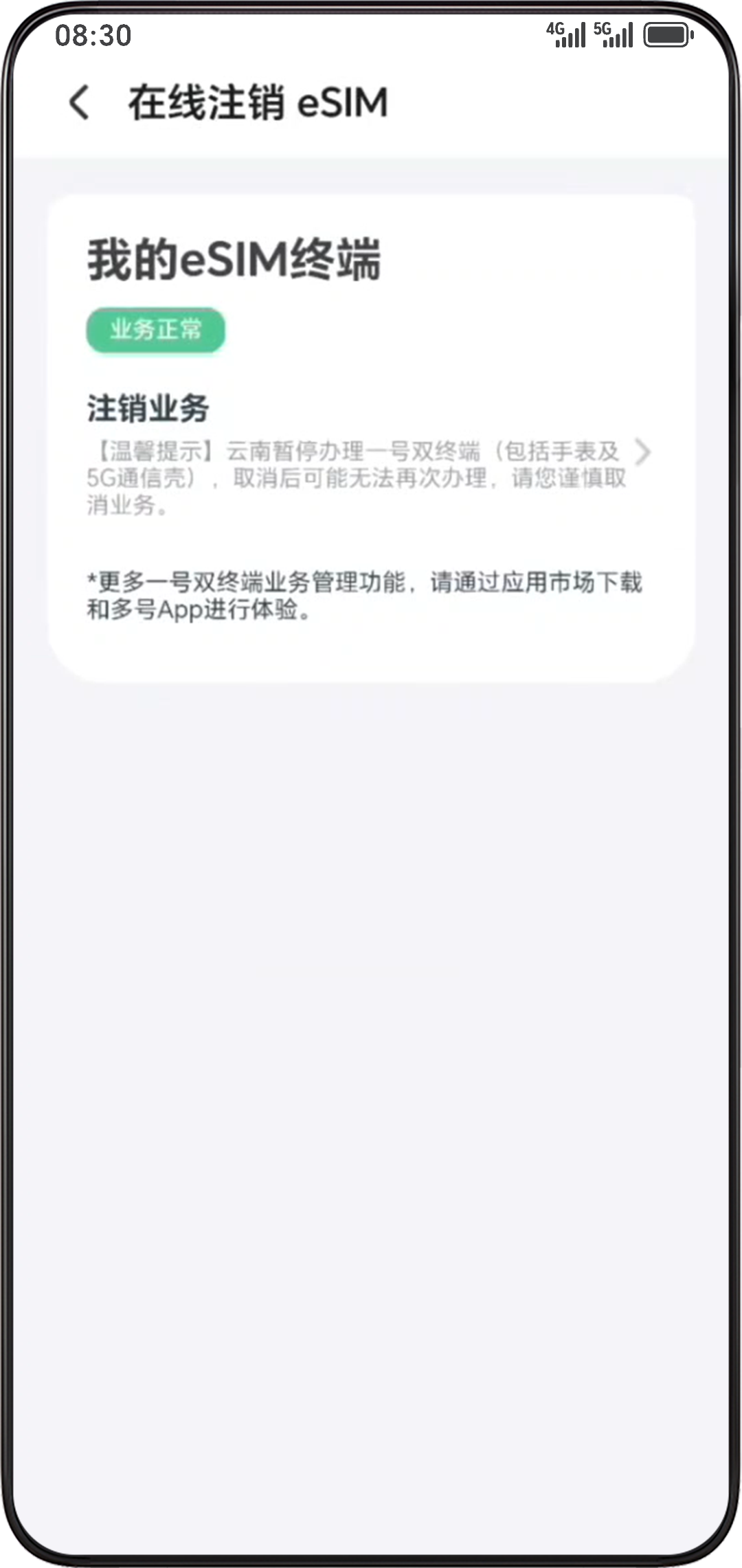 打开荣耀运动健康 App,进入设备详情页。点击,在弹出的对话框中勾选对应的号码,跳转至在线注销 eSIM 页面。选择注销业务,点击,根据界面提示完成注销。注销成功会收到短信提醒。