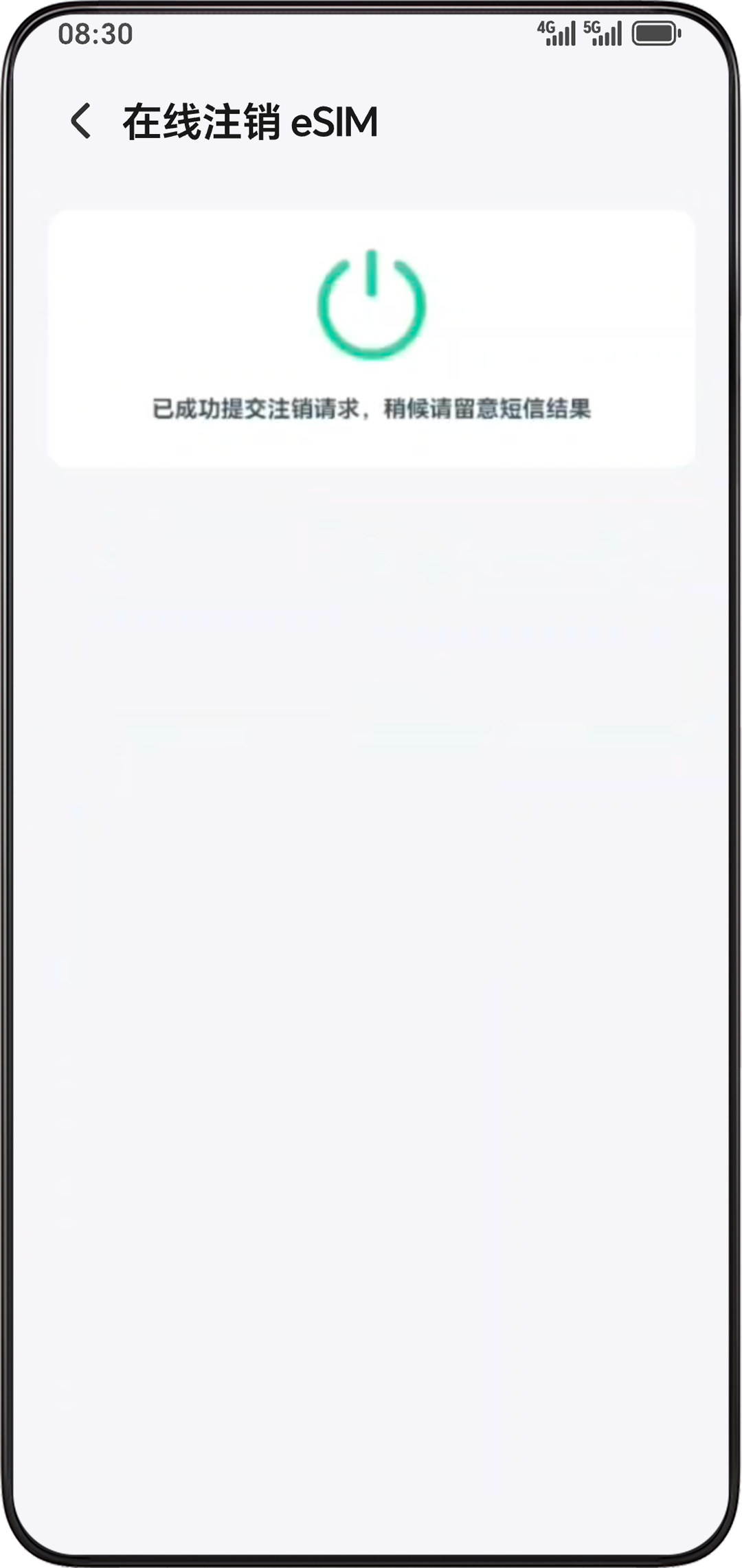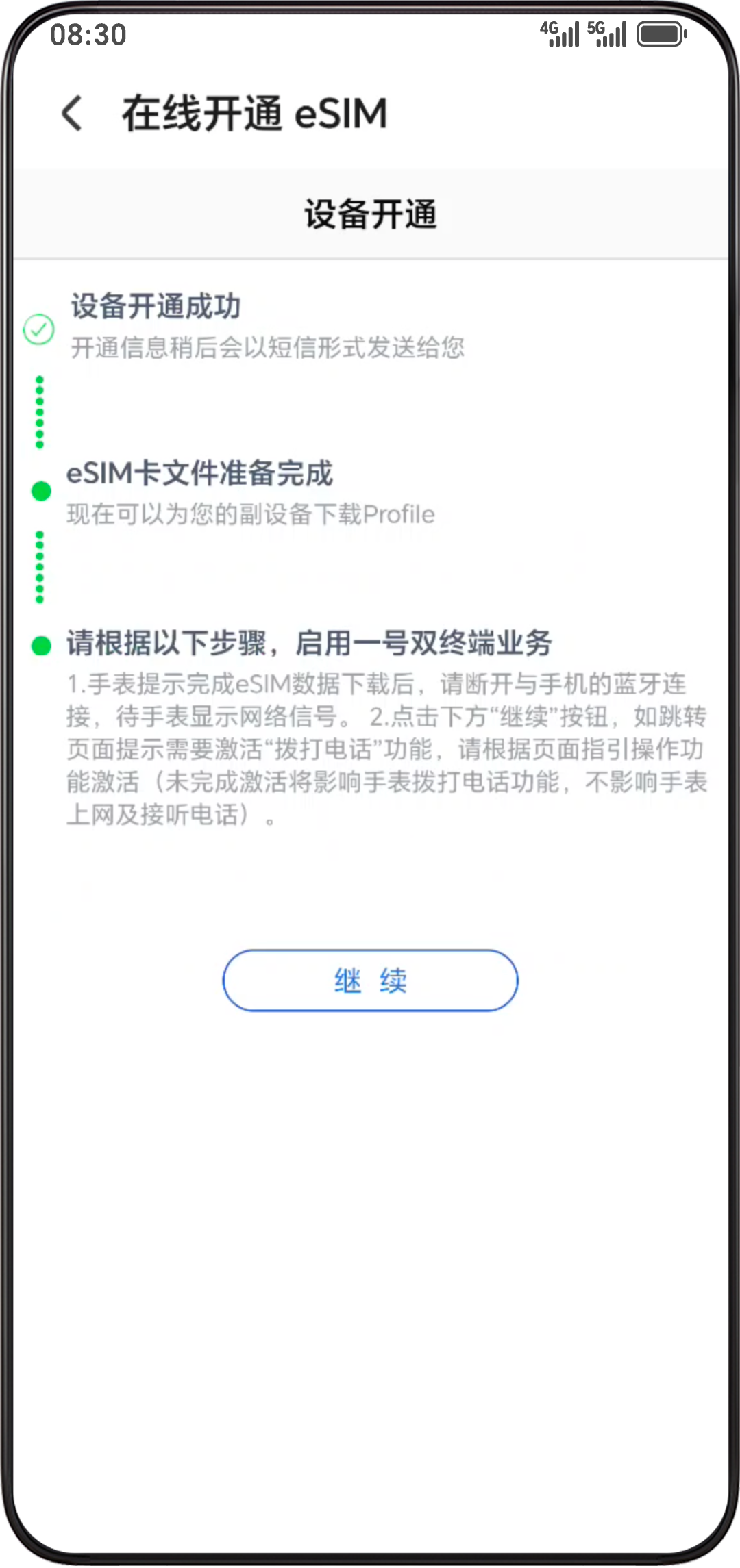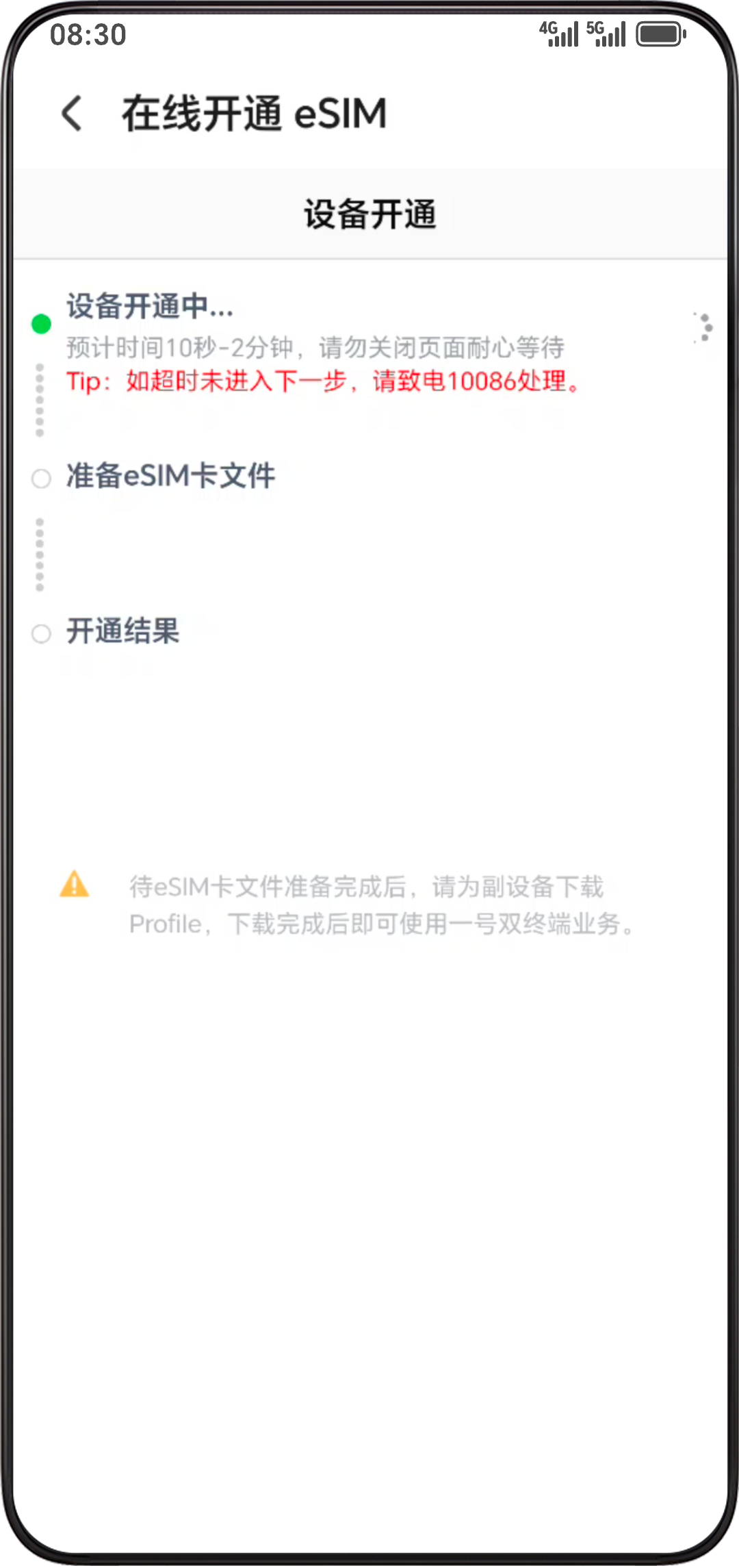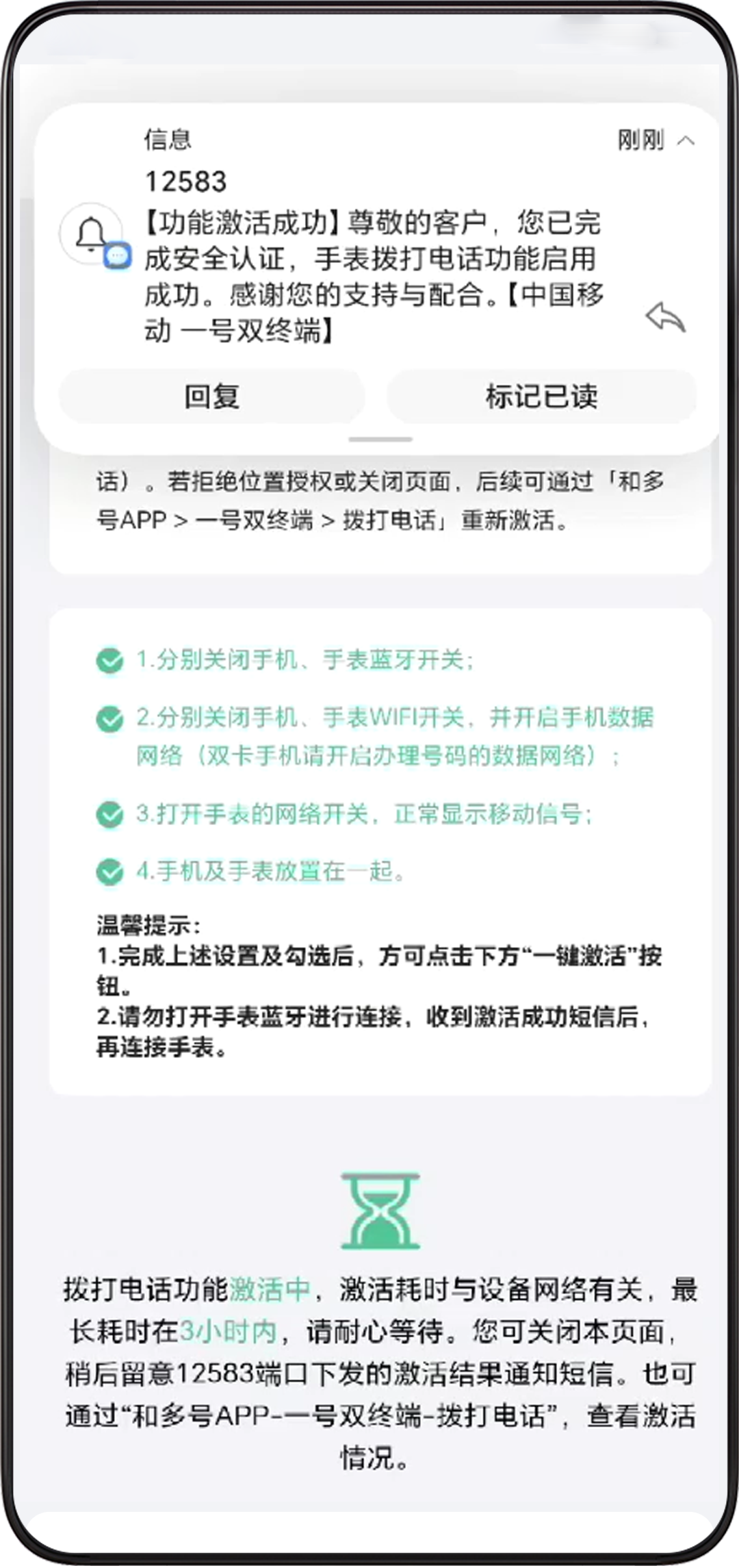 - 等待移动运营商开通一号双终端业务,开通成功后手机会收到短信提醒,将自动下载 eSIM 卡数据。