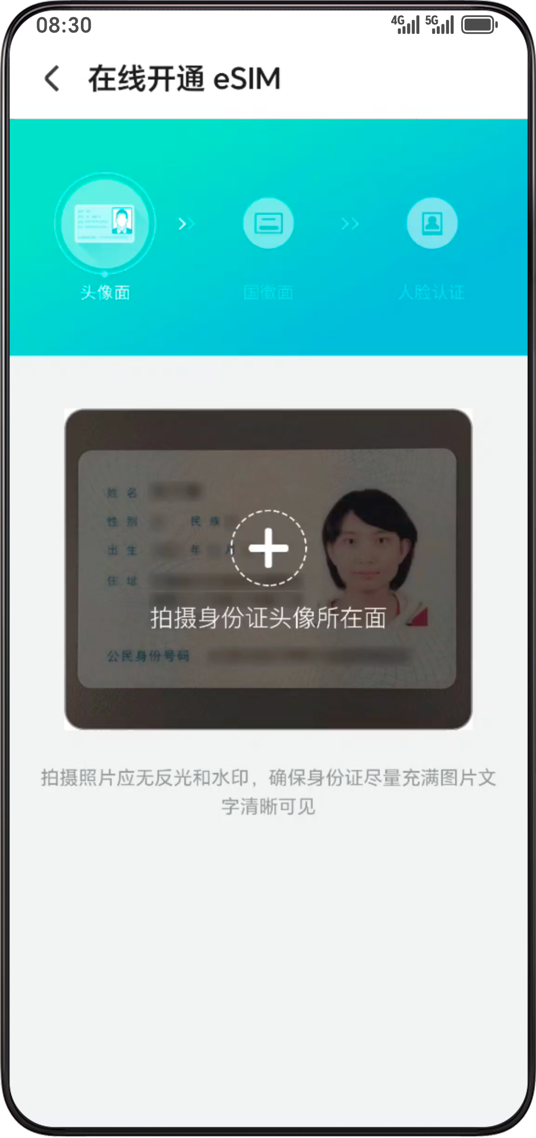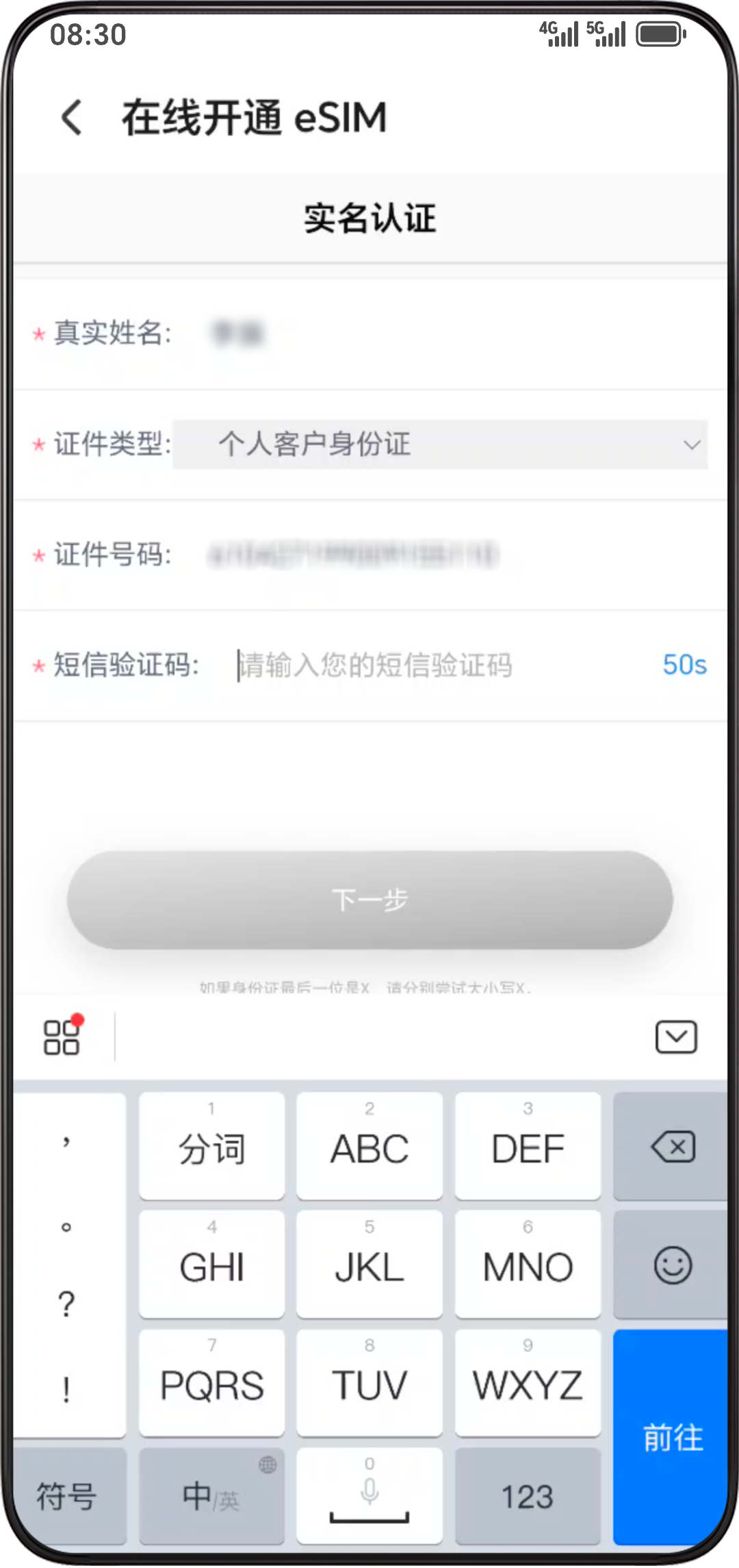 - 根据界面提示输入个人信息,上传身份证,进行人脸识别等,完成身份认证。完成认证后等待运营商身份验证审核,审核通过后提示认证成功。