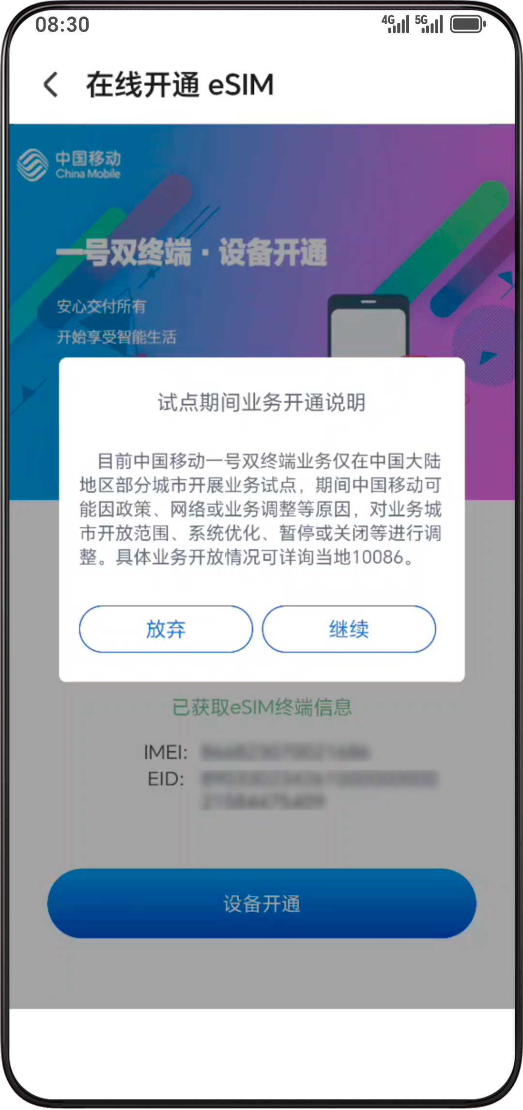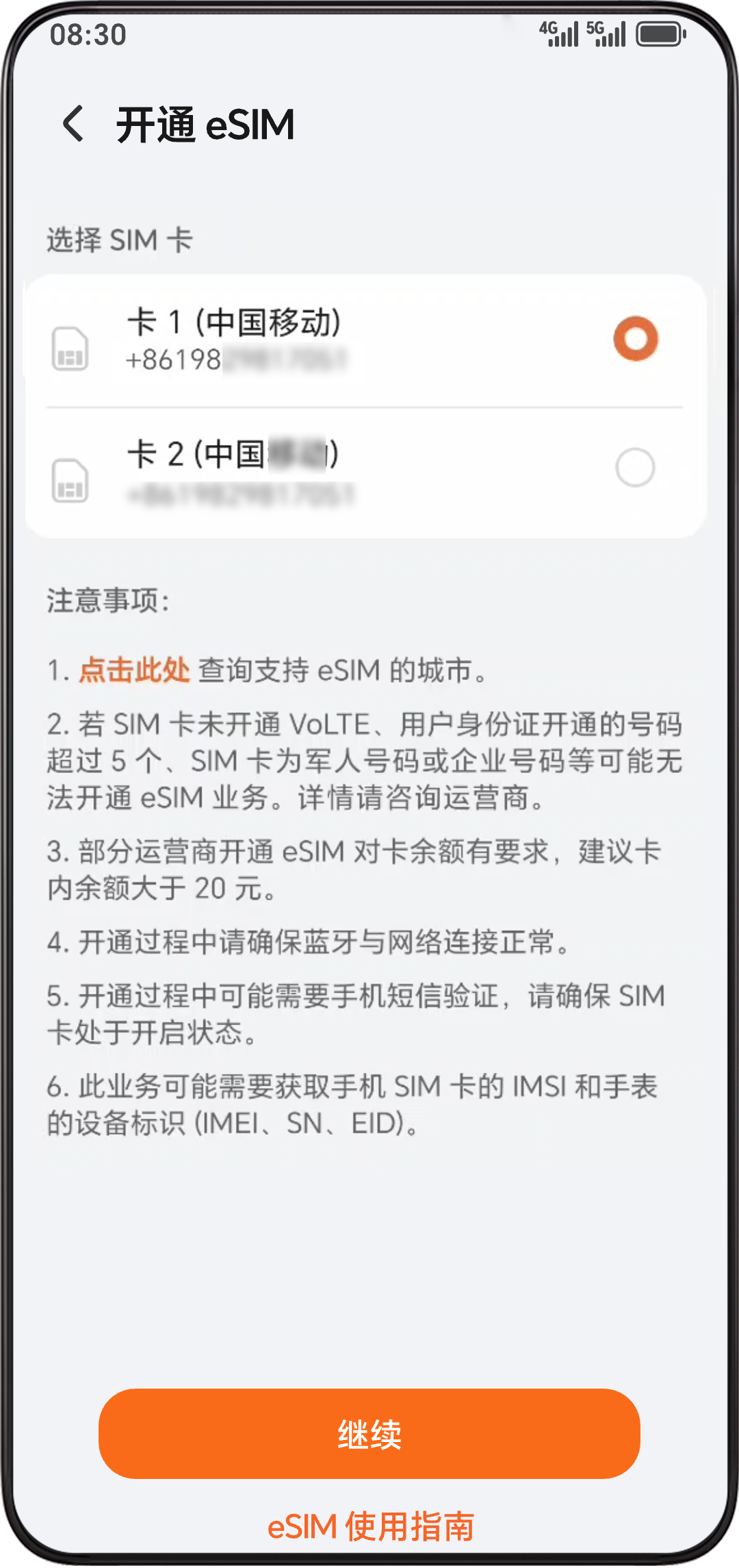 - 选择要开通 eSIM 业务的中国移动手机号码,点击继续,进入中国移动在线开通 eSIM 页面。