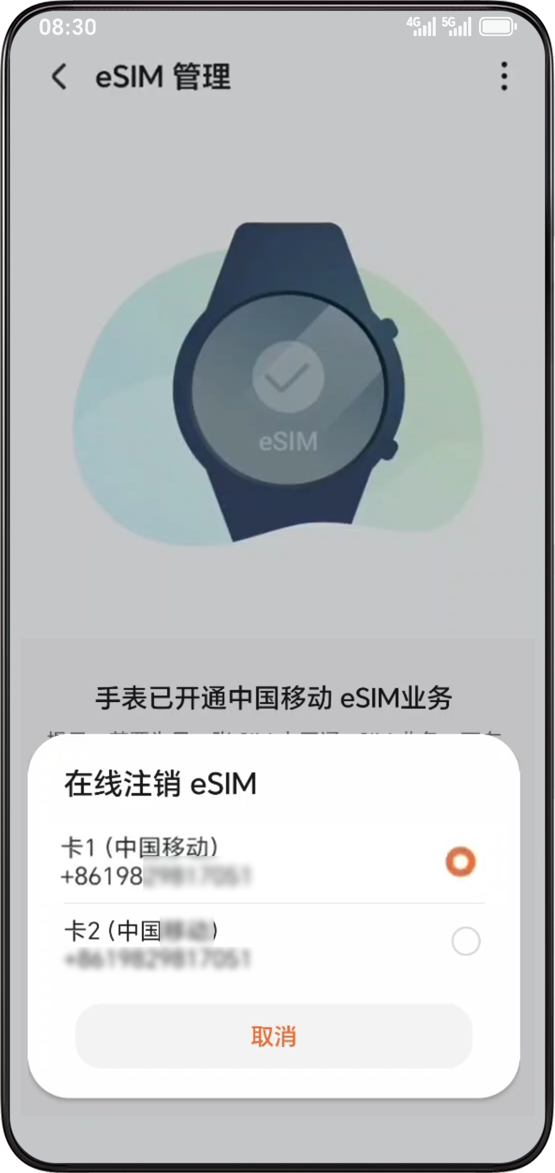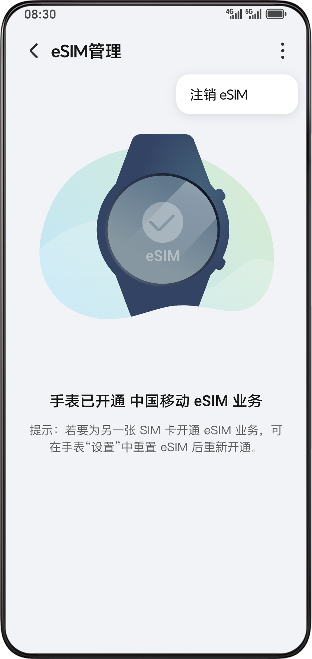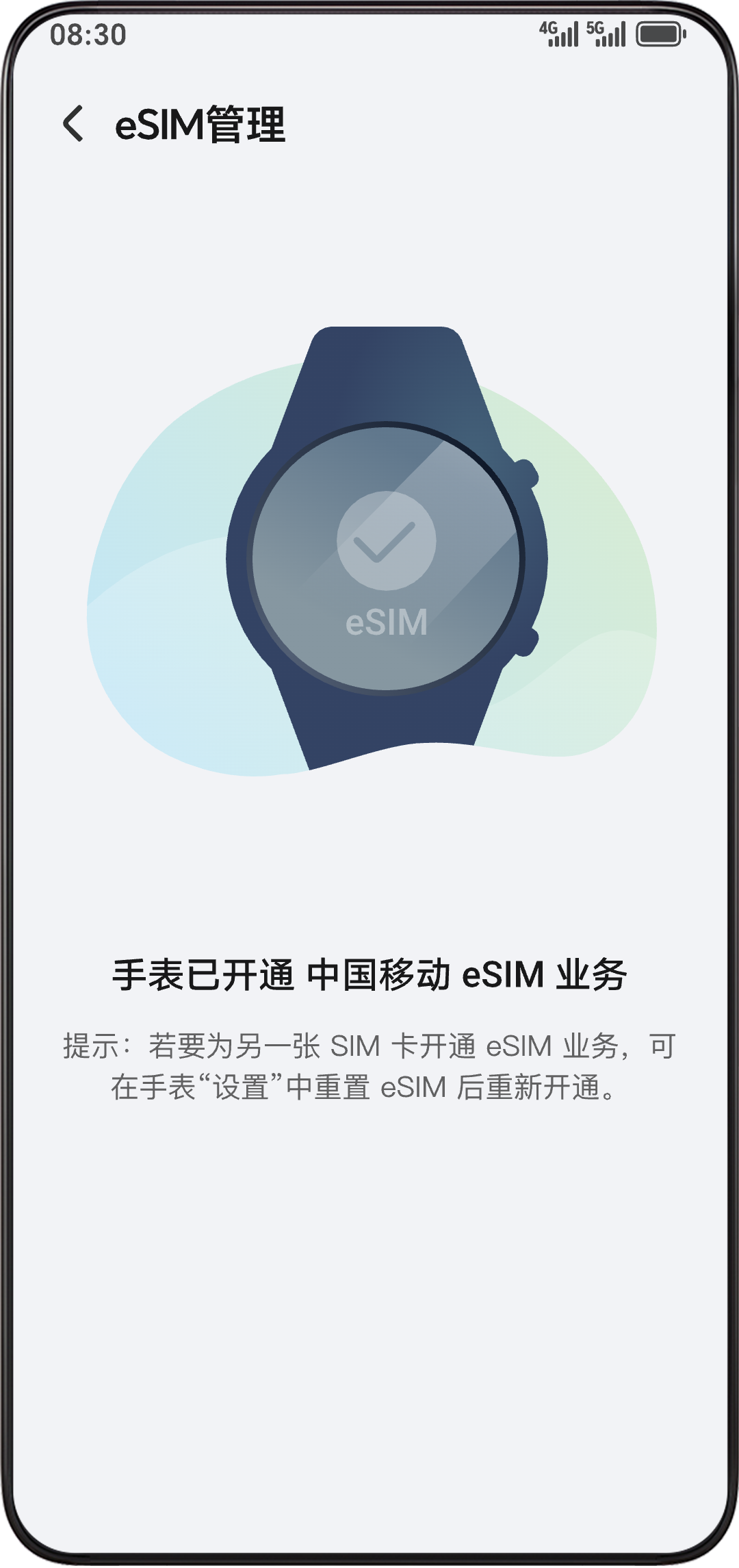 - 激活成功后进入 “eSIM 管理”页并提示手表已开通中国移动 eSIM 业务。