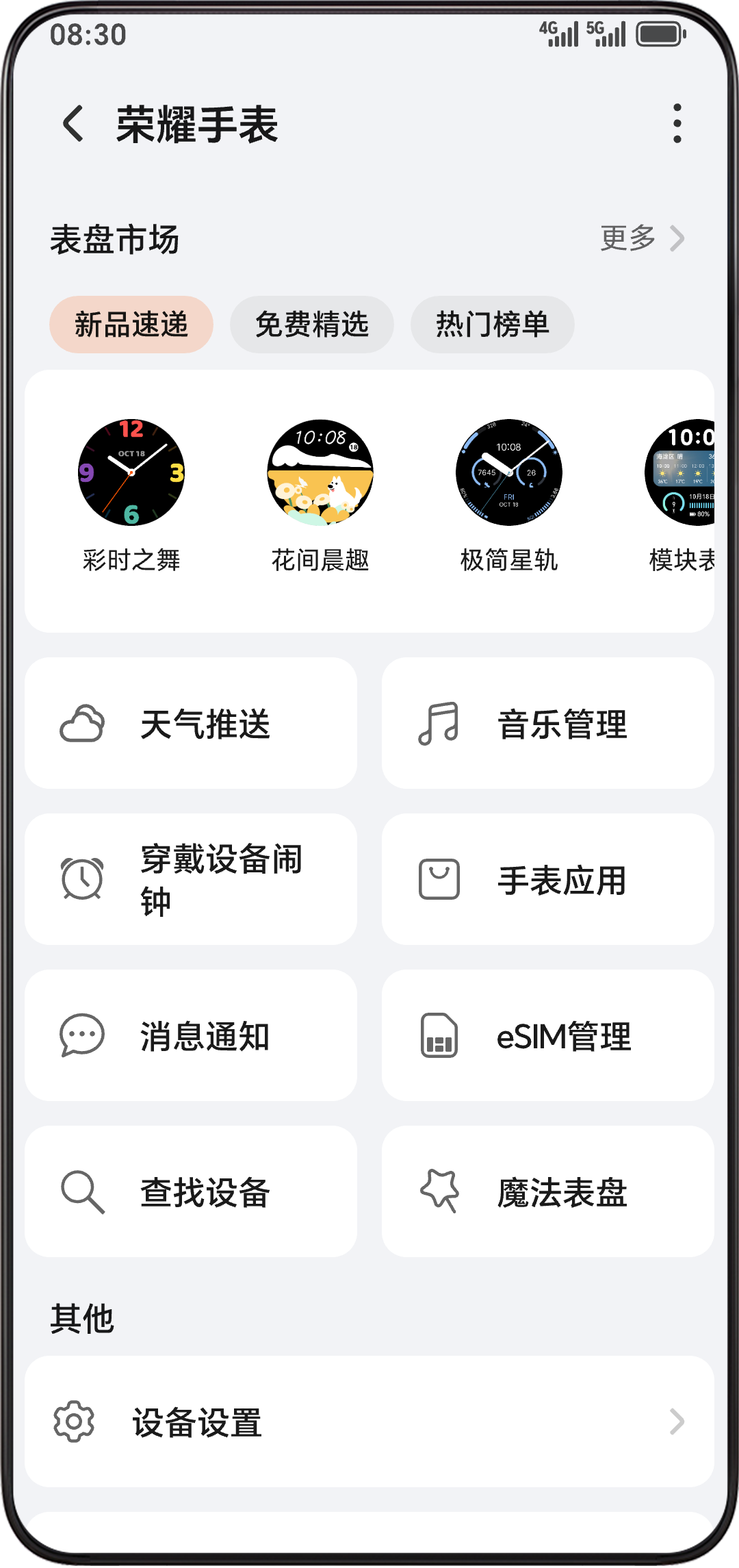 - 打开荣耀运动健康 App,进入设备详情页。点击 ,即可开通 eSIM 一号双终端业务。