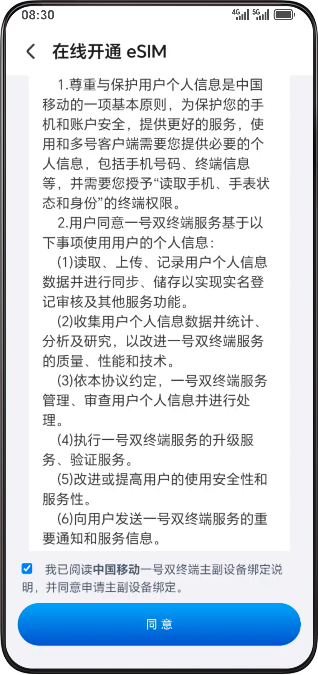 - 点击设备开通,阅读协议并勾选“我已阅读中国移动一号双终端主副设备绑定说明,并同意申请主副设备绑定”,点击同意。