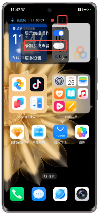 未设置录屏灵动胶囊时:点击胶囊右端三个点按钮,在录屏悬浮窗中打开