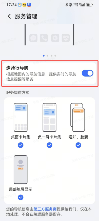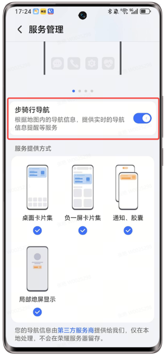 请根据需要允许在熄屏显示、灵动胶囊、通知、桌面、负一屏等入口显示步骑行导航信息。