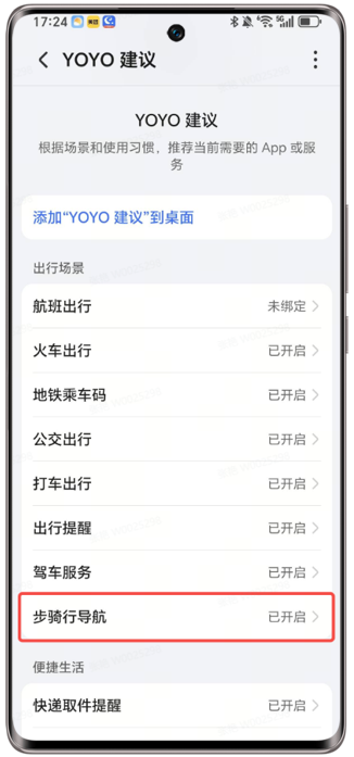 设置方法:系统设置>智慧助手/荣耀AI&YOYO>YOYO建议>步骑行导航