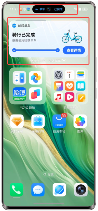 在支持的平台内扫码开锁单车或助力车后,桌面和负一屏的YOYO建议卡片将为您提供骑行订单进度提醒,如当前骑行状态、待支付状态等。点击卡片可直接跳转App的订单详情页查看完整信息。