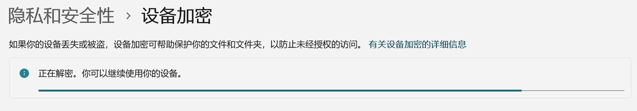 关闭:设置>隐私和安全性>设备加密,选择关闭(注意等待解密进度条执行完毕)。