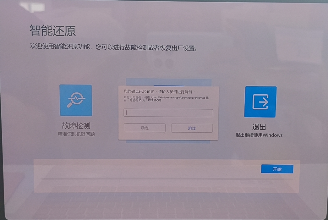 进入还原界面,可能会看到如下输入恢复密钥提醒: