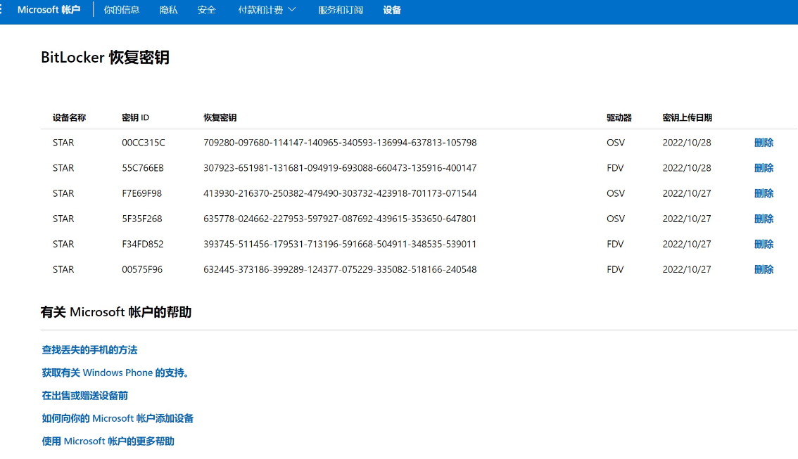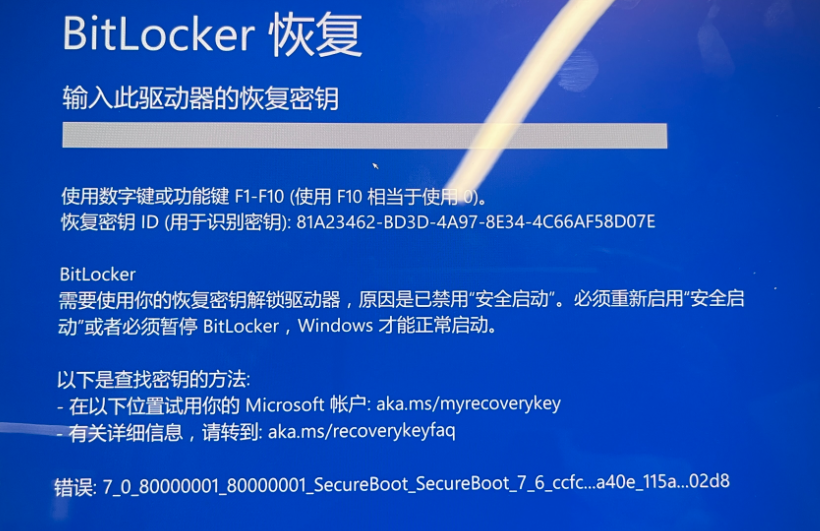 获取密钥操作:打开https://account.microsoft.com/devices/recoverykey,登录到 Microsoft帐户;根据还原界面要求的密钥ID(锁定界面提示中会有说明)查找对应的恢复密钥,解锁磁盘。(更多内容可参考微软官网在 Windows 中查找 BitLocker 恢复密钥 - Microsoft 支持。)