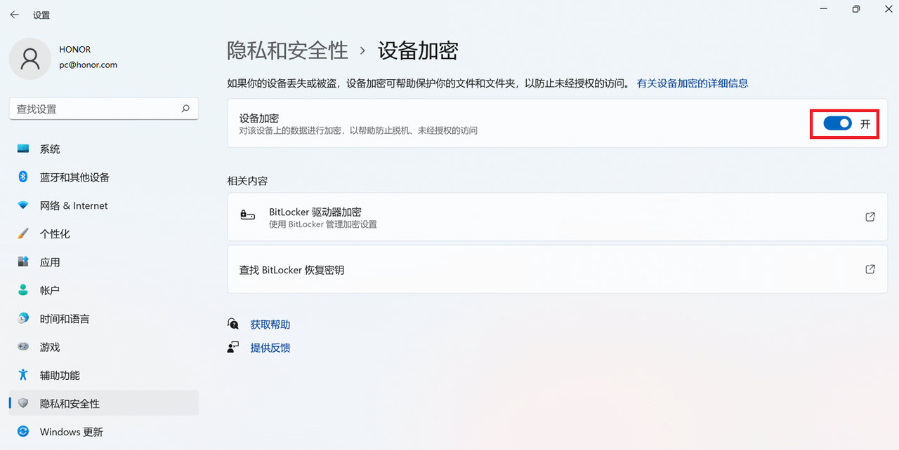 打开:设置>隐私和安全性>设备加密,选择打开(如果用户使用的是本地账号,需要登陆微软账户后开启)。