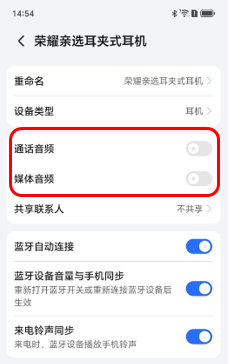 若不想蓝牙设备上电/开机后自动连接手机,在与蓝牙设备连接时,手动关闭详情中的通话音频和媒体音频即可。