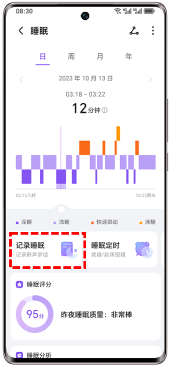荣耀运动健康>健康>睡眠卡片>记录睡眠