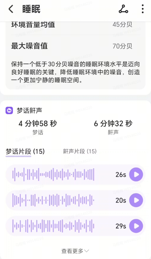 查看路径:出睡后若存在梦话鼾声音频,可在当日睡眠详情页-睡眠报告-梦话鼾声模块,找到对应的音频记录。