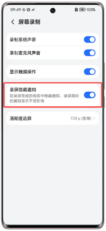 打开“录屏隐藏通知”开关后,录制结果视频中将不会显示灵动胶囊动态卡片,开启路径: