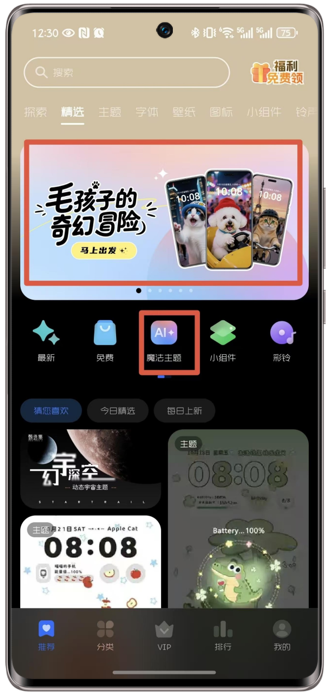 上传图片:点击荣耀主题>推荐>精选>魔法主题,进入AI魔法主题功能页面,上传1张符合要求的猫或狗图片(不支持上传多张图片)。