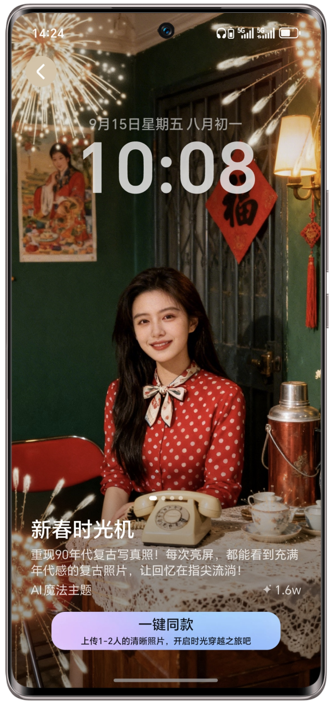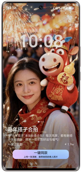 新春期间,AI魔法主题推出马年搭子合拍、人人做财神、新春时光机,请将荣耀主题APP升级到20.1.24.300及以上版本