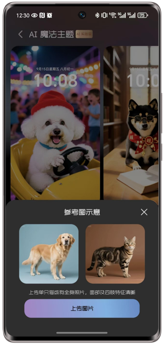 AI魔法主题是荣耀主题推出的特色功能,上传一张猫或狗的图片,可自动生成至多8张超大壁纸库的主题包,应用后每次亮屏会切换毛孩子奇幻冒险的不同图片。