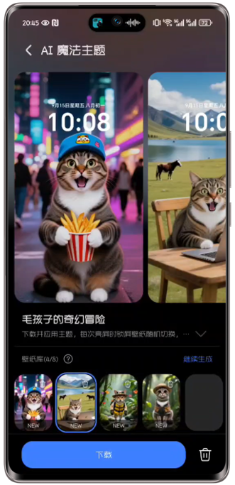 查看主题:生成完成后,可在荣耀主题>我的>我的下载>主题中找到生成的AI魔法主题。