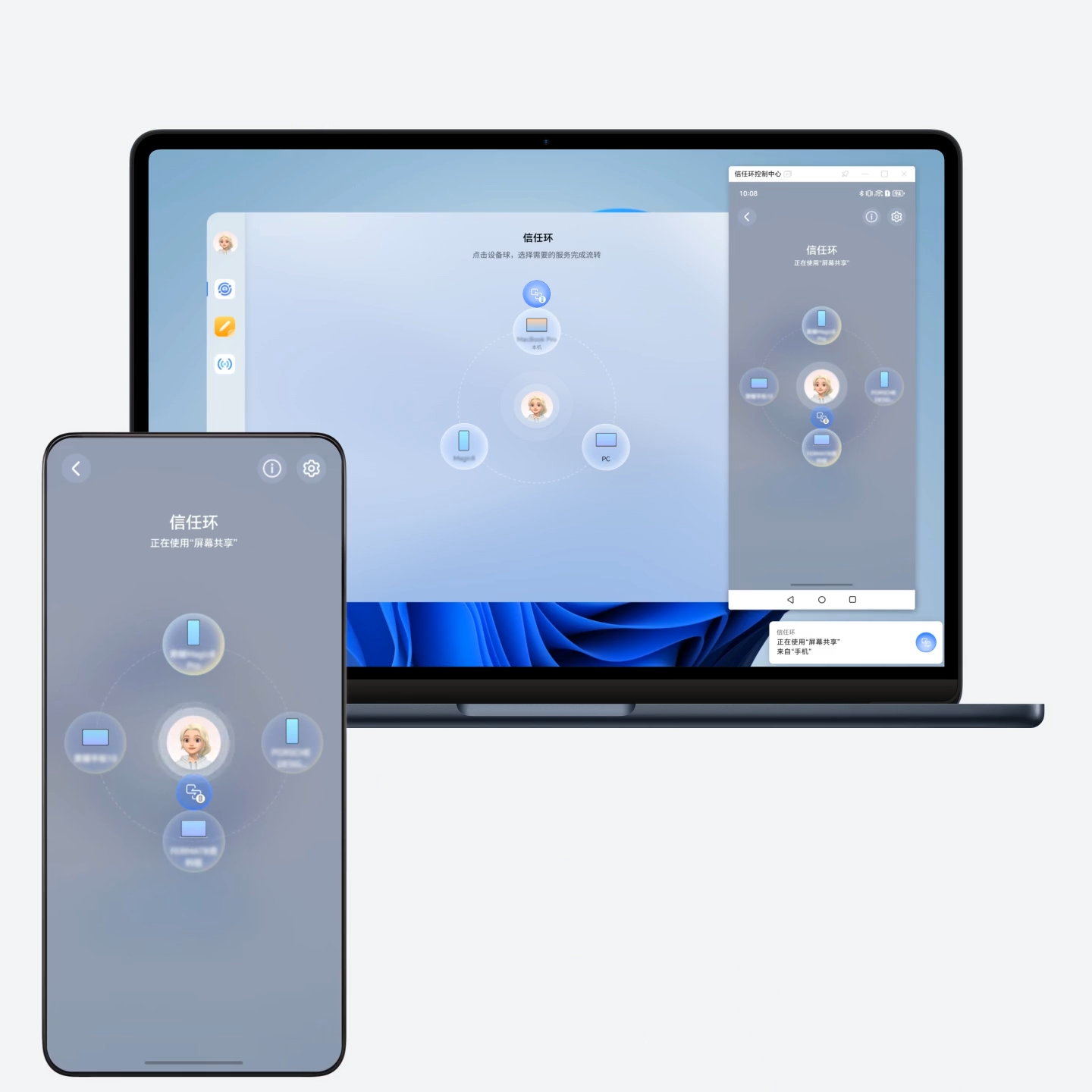 7. 跨品牌屏幕共享:同一WLAN 下,手机屏幕可以共享至同账号信任环中的其他品牌电脑,在电脑上就能查看手机屏幕,还可以直接拖拽互传文件,跨端复制、粘贴文本,多屏办公更专注高效。