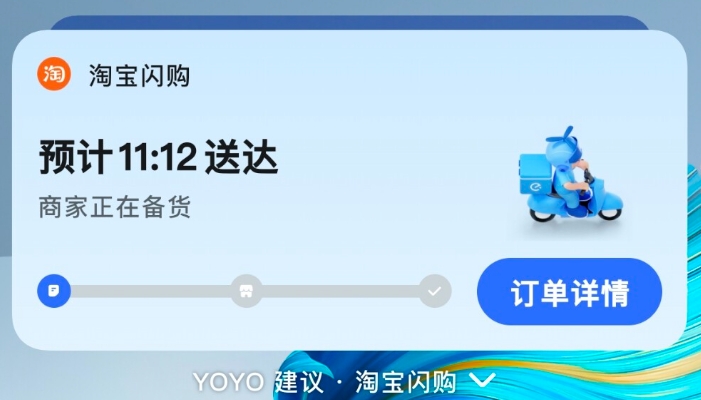 在平台点外卖后,桌面和负一屏的YOYO建议将为您提供外卖进度提醒,如配送距离、预计送达时间等。